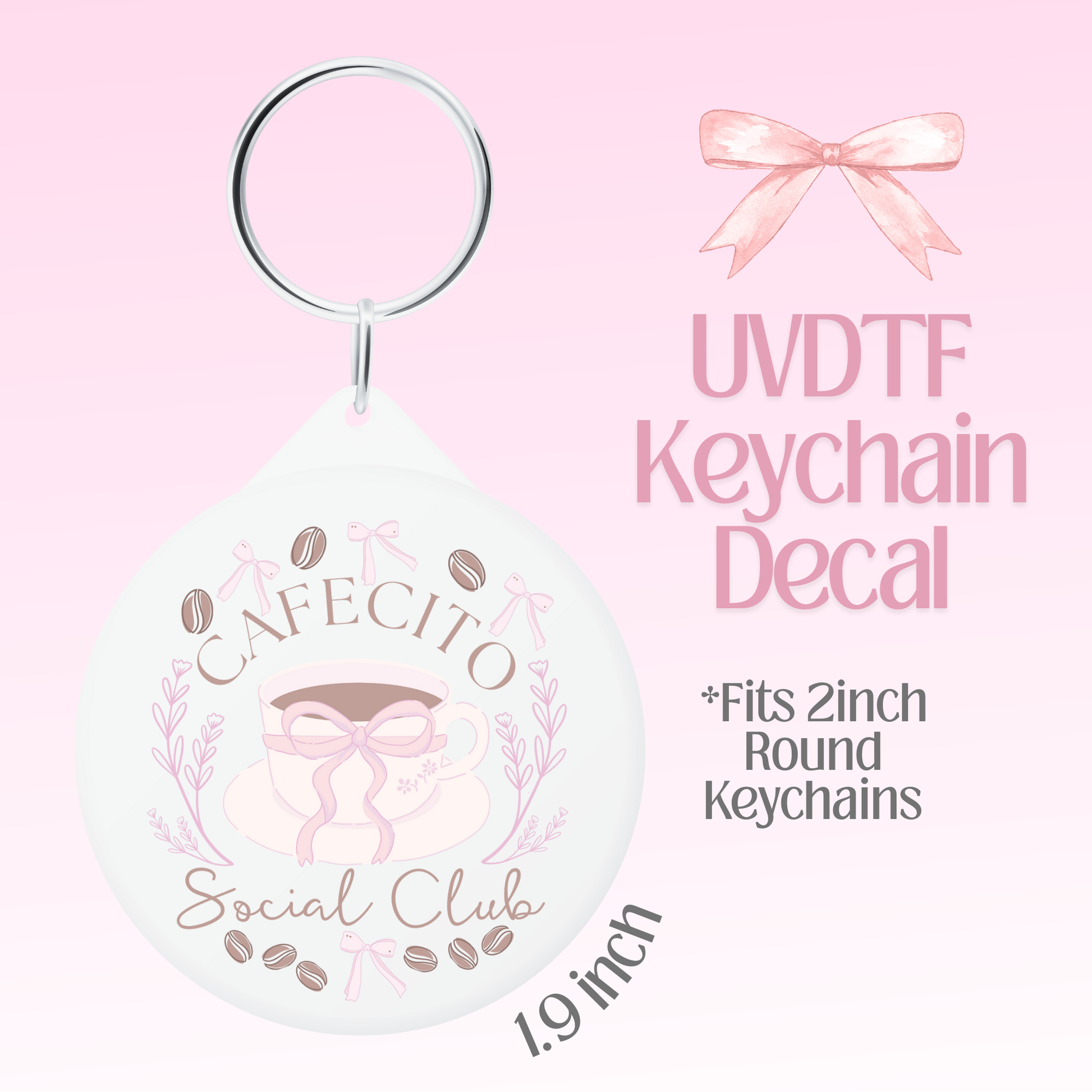 Double sided UVDTF round keychain decal.